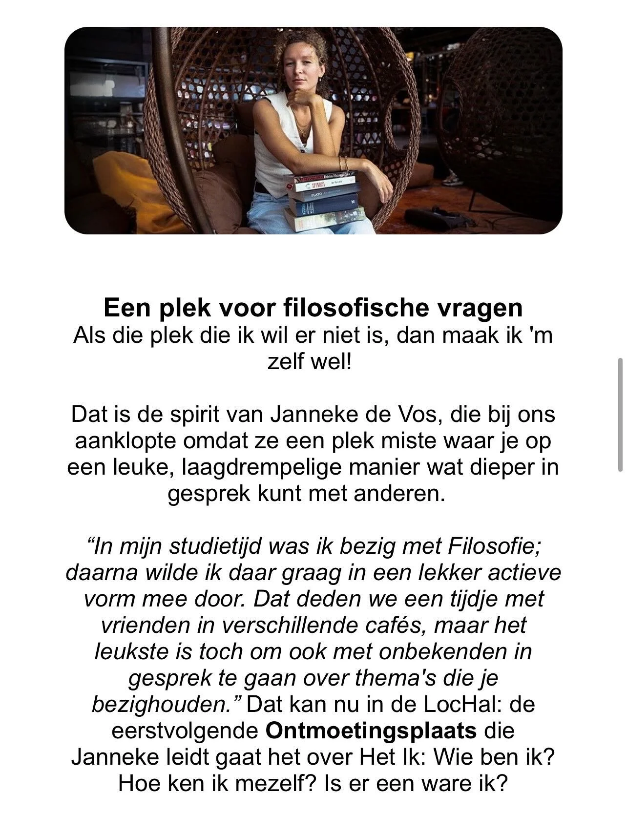 Al snel merkte ik: zo'n plek was er eigenlijk niet. Natuurlijk zijn er genoeg lezingen en presentaties over filosofische of maatschappelijke thema’s, maar een ruimte waar écht het gesprek en de ontmoeting centraal staan? Die miste ik.